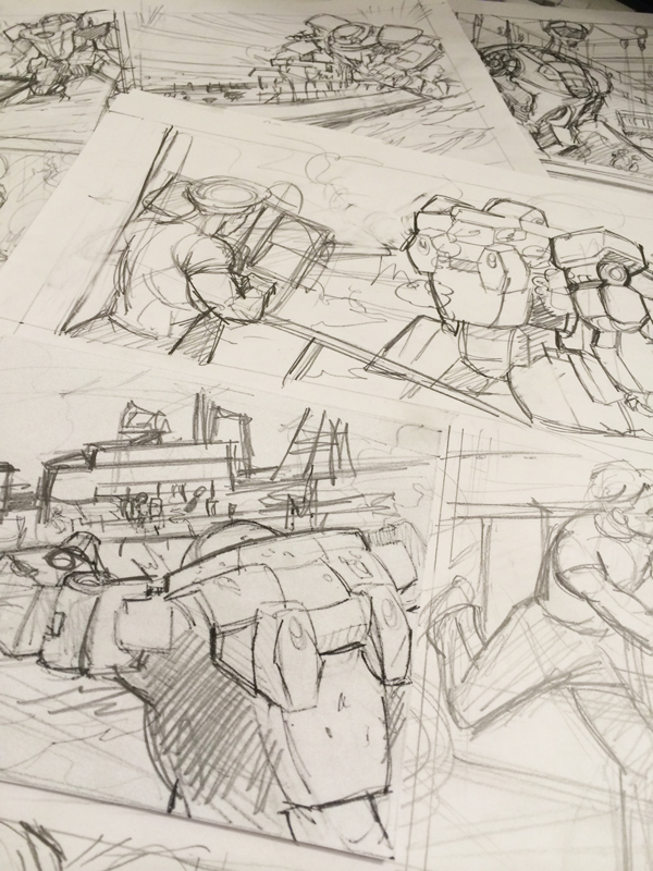 Il lavoro “Giganti d’Acciaio” deve essere un manga. Allo stesso tempo deve essere realistico. Quindi devo rendere più realistico il mio stile manga, senza sfociare nel mio realismo occidentale. Un bel casino. Al contrario, con il videogioco devo diventare ancora più giapponese. Se non divento schizofrenico adesso, non lo divento più.